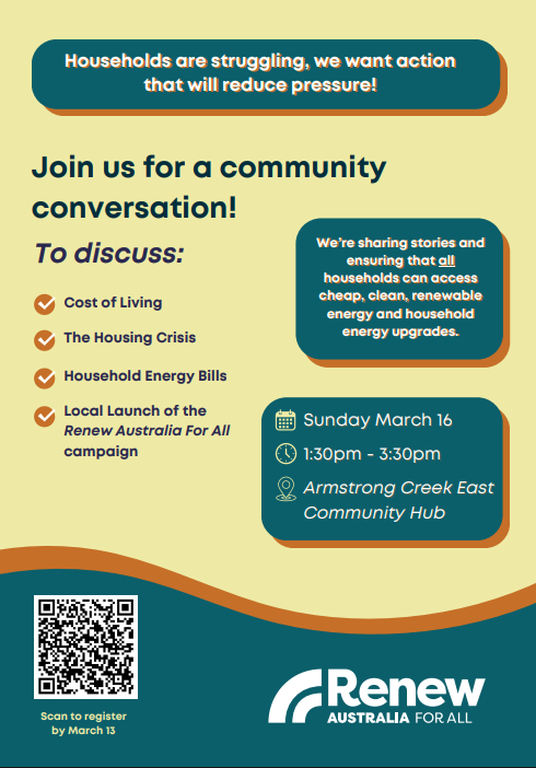 Real Deal Geelong Alliance invites you to join in conversation about the cost of living, in particular the housing crisis and household energy bills. We know many households are struggling and we want to see action to reduce pressure on households. We will share stories about how these issues are impacting us and the solutions we are seeking to address this, ensuring these issues are front and centre during the federal election and beyond.